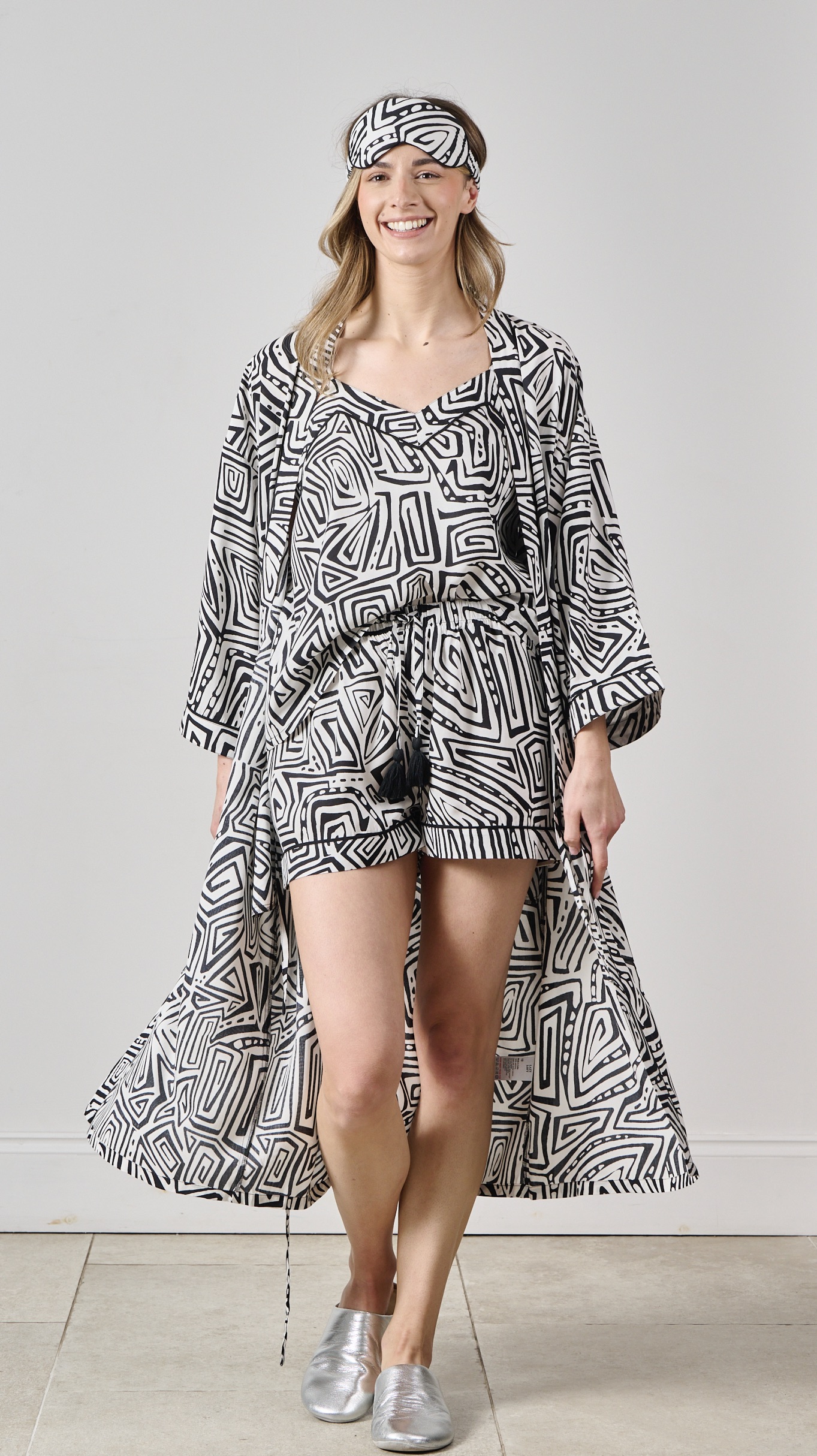 Comfortable stylish pyjama shorts in our soft luxurious printed modal woven fabric. Available in five stunning prints with contrast piped trims. Designed with side seam pockets, a gently elasticated waistband and an adjustable contrast tie front fastening with tassles to ensure the perfect fit. Cordinates perfectly with our camisole or long sleeved pyjama top. Modal is extremely breathable due to the micropores within the fabric which absorb 50% more water than cotton ensuring a perfect nights sleep.